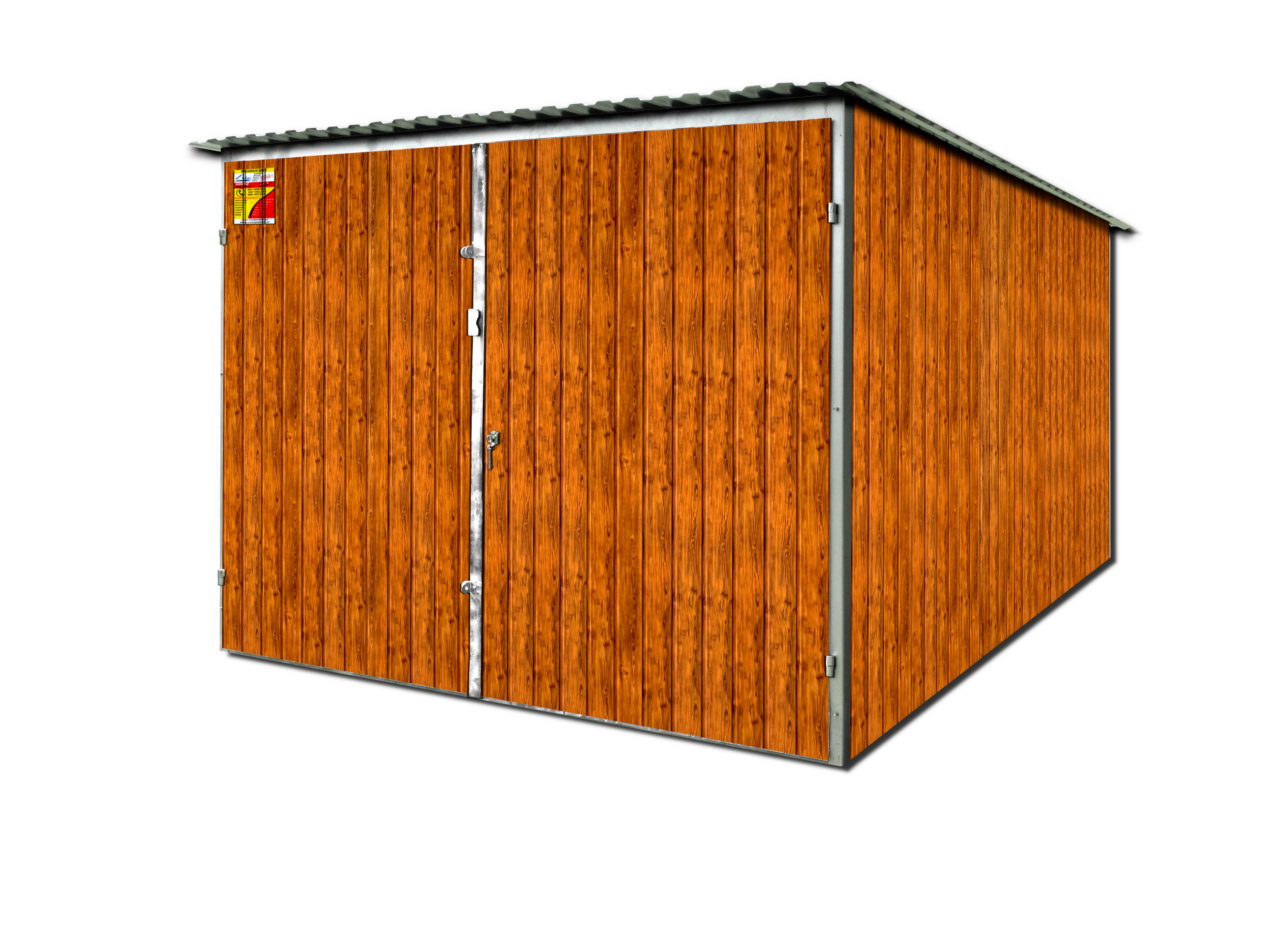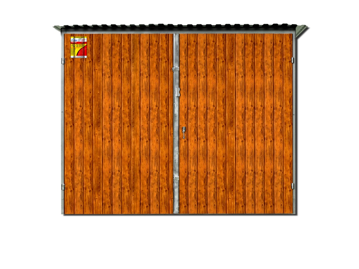 Plechová garáž 3x5, střecha se spádem dozadu v barvě dřeva s dvoukřídlými vraty.