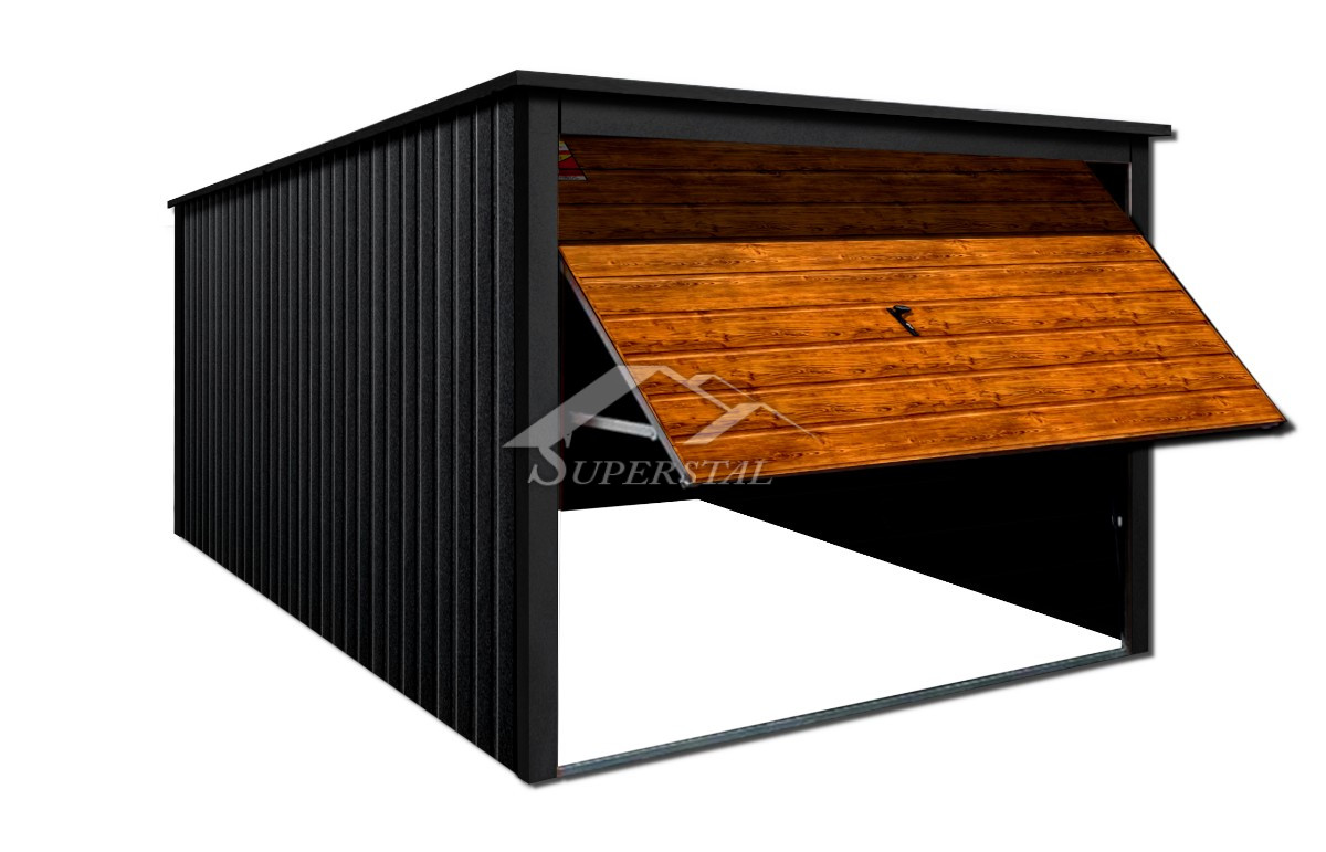 Nosná konstrukce garáže je z úhelníků a C profilů ohýbaných za studena. Pod střechou jsou použity C profily pro vyšší pevnost střechy. Celý plášť je z barevného plechu I. jakosti a je přinýtován k konstrukci hliníkovými nýty. Výklopná brána – ruční zdvih nahoru (možnost výběru dřevodekoru: borovice, ořech nebo zlatý dub). V dolních rozích po obou stranách brány jsou pružiny pro usnadnění zvedání.