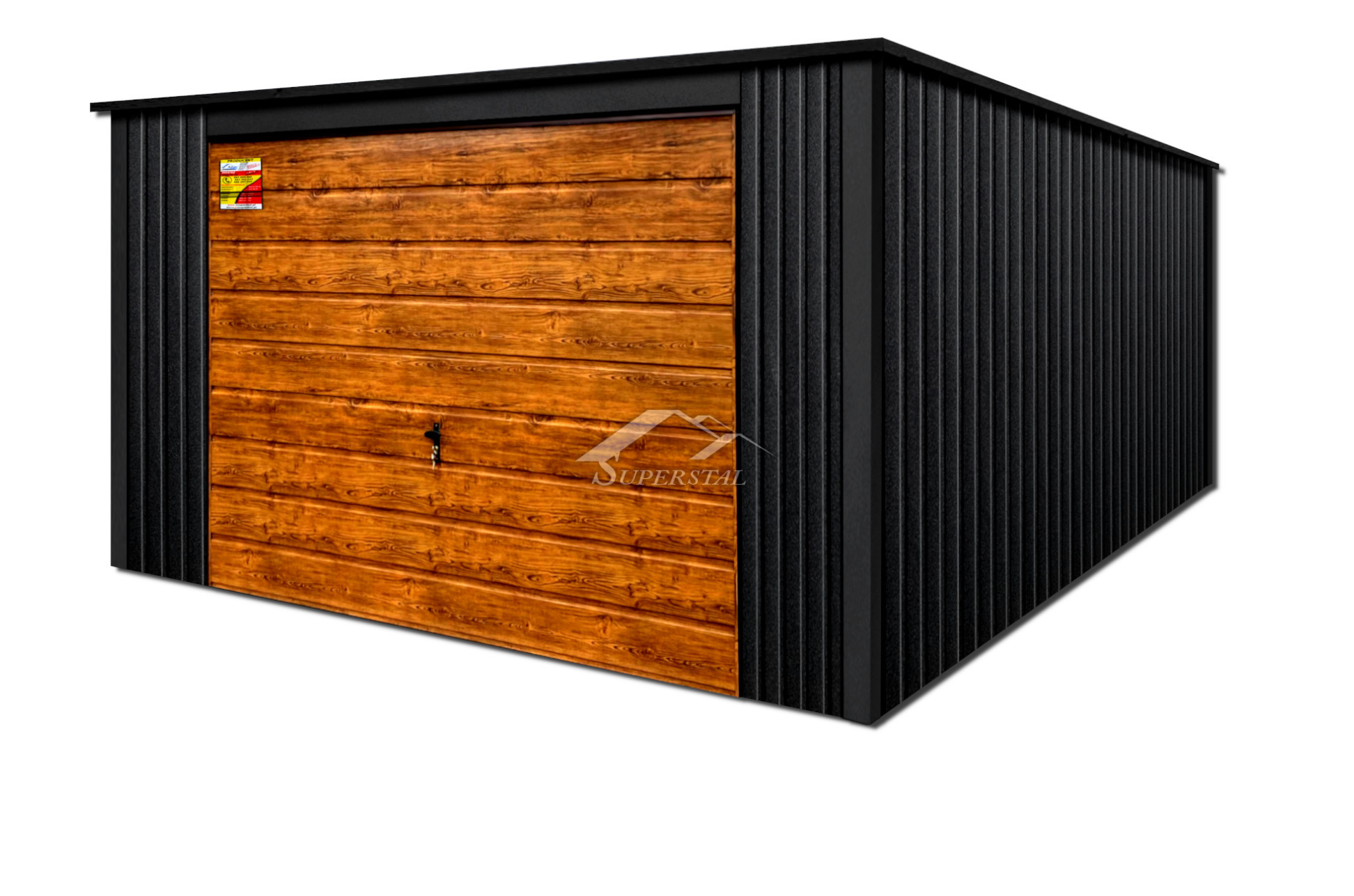 Nosná konstrukce garáže je z úhelníků a C profilů ohýbaných za studena. Pod střechou jsou použity C profily pro vyšší pevnost střechy. Celý plášť je z barevného plechu I. jakosti a je přinýtován k konstrukci hliníkovými nýty. Výklopná brána – ruční zdvih nahoru (možnost výběru dřevodekoru: borovice, ořech nebo zlatý dub). V dolních rozích po obou stranách brány jsou pružiny pro usnadnění zvedání.
