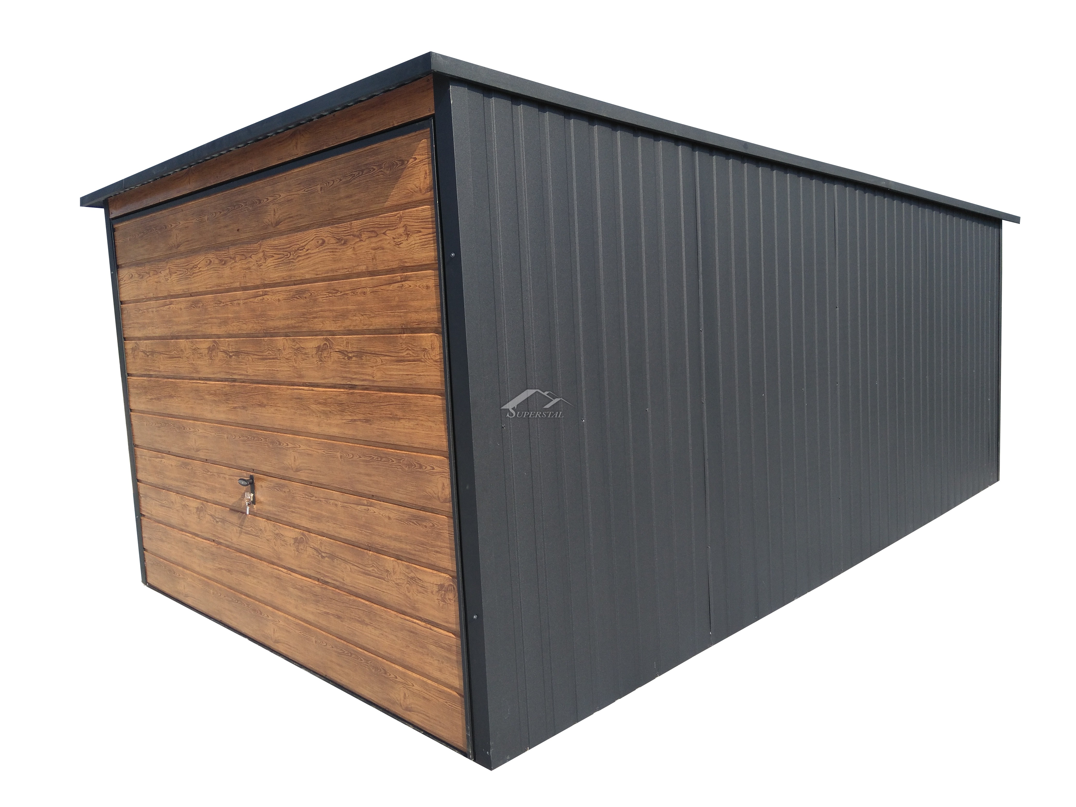 Provedení LUXPlechová garáž 3x6 se zadním spádem, v matné černé barvě, s výklopnými vraty z borovice ve vodorovném širokém panelu.